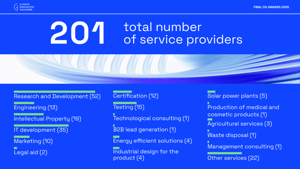 Компанії-переможці можуть використати ваучер для розробки та впровадження зелених інновацій на різних етапах діяльності – від захисту інтелектуальної власності та промислового дизайну прототипів до сертифікації продуктів та проєктування своїх виробничих потужностей. Гранти до 50 000 євро покривають 75% витрат на заявлені послуги.