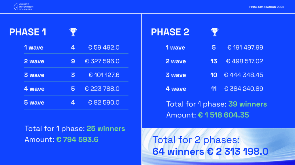 Від старту у 2017 році «Кліматичні інноваційні ваучери» стали найбільшим в Україні грантовим конкурсом для зелених інновацій: понад півсотні українських компаній отримали підтримку понад 2 мільйони євро. У фінальній хвилі другої фази ще 11 інноваторів отримають гранти для розвитку кліматично-дружніх технологій.