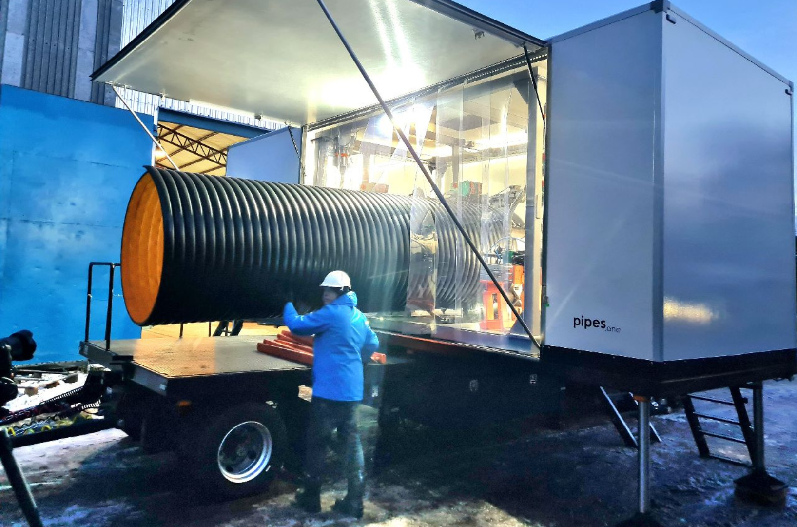 This process remained unchanged for over half a century until the Ukrainian company Pipes.One decided to challenge the inefficiencies of the classic scheme and created the world’s first polymer pipe factory on wheels. It is a mobile unit that arrives directly at the construction site and produces pipes with the required diameter and length on the spot.